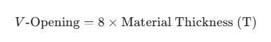 Beispiel: Wenn Sie 2 mm dicken Baustahl biegen, benötigen Sie eine 16 mm V-Öffnung (2*8=16).